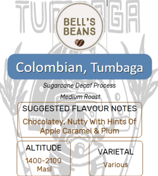 This is a fully washed medium roasted sugarcane decaffeinated Columbian arabica coffee.